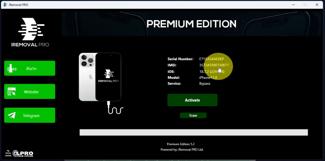 O software iRemoval Pro (Activation Bypass) foi desenvolvido para contornar o Bloqueio de Ativação e Bloqueio de Proprietário em poucos passos em qualquer iPhone XR ao 16 Pro Max e iPads com Processadores A12 Bionic ao M4, com iOS 18.3 ao 26.1. Somente para aparelhos com IMEI limpo, sem Blacklist.